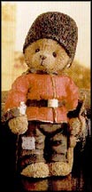 Cherished Teddies Figurine. Series: Exclusive To Canada And UK. Teddy Standing With Red Shirt And Black Pants, Black Hat. Introduced 1995. Retired 1999. List Price: $25.00.