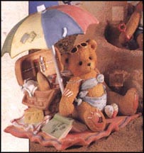 Cherished Teddies Figurine. Series: By The Sea. Girl With Bikini Having A Picnic Under The Umbrella. Introduced 1997. Retired 2000. List Price: $55.00.